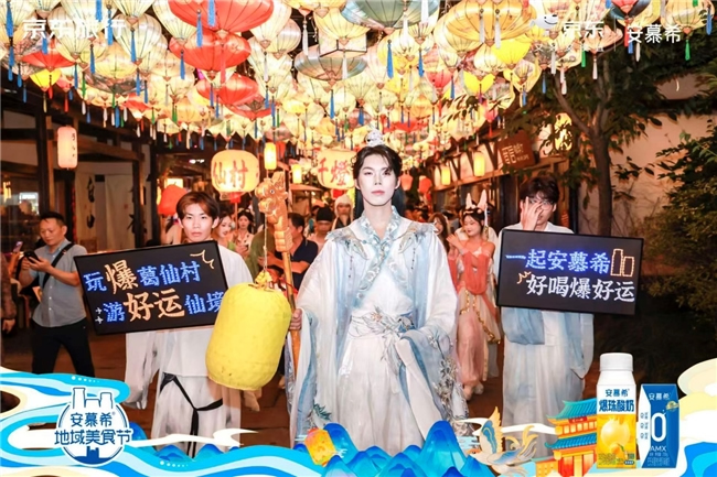 與景區(qū)千燈會深度合作,定制安慕希主題花燈共同組成巡游方陣。由好運仙官們手持花燈引領巡游,形成"品牌-文化-游客"三方共創(chuàng)的流動盛景。