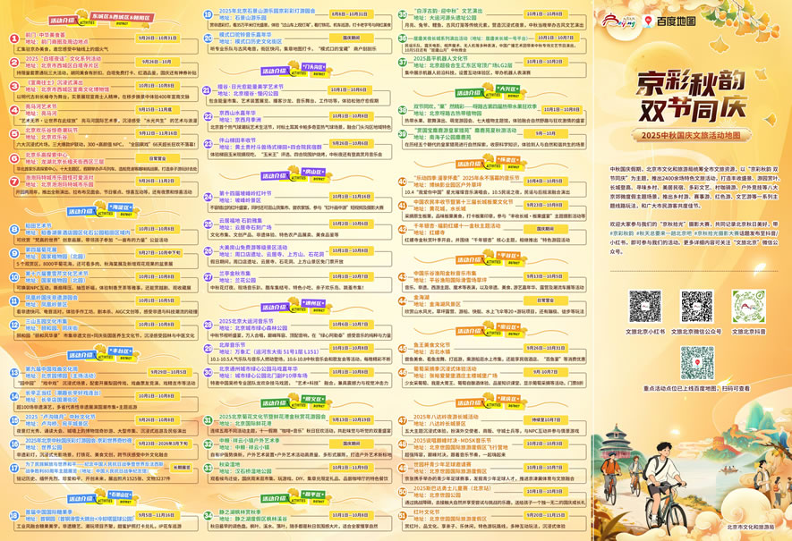 為豐富假期生活,北京市文化和旅游局聯(lián)合百度地圖推出“中秋國慶文旅活動地圖”,集中呈現(xiàn)全市50余項特色文旅活動,涵蓋自然風(fēng)光、文化體驗、親子娛樂、紅色教育等多個主題,助力公眾輕松規(guī)劃假日行程,盡享京秋韻味。