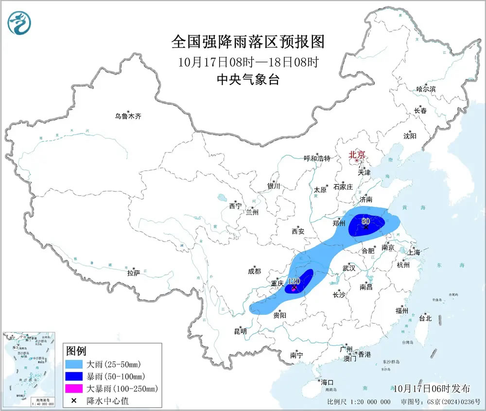 預計,10月17日8時至18日8時,重慶東部和北部、湖北中西部、河南中東部、山東南部、安徽北部、江蘇北部、湖南西北部、貴州西部和北部等地部分地區(qū)有大到暴雨,其中,重慶東南部、貴州東北部等地局地有大暴雨(100~120毫米)。上述部分地區(qū)伴有短時強降水(最大小時降雨量20~40毫米,局地可超過50毫米),局地有雷暴大風等強對流天氣。